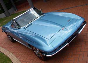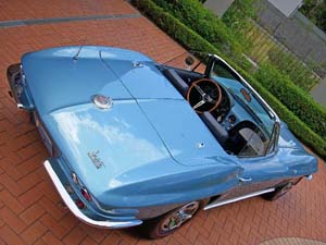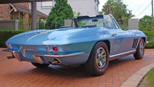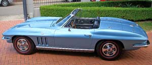 The car is a 1966 corvette stingray convertible in Nassau blue, numbers matching, 327-350 HP, 4 speed manual, with hard top and white soft top.